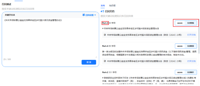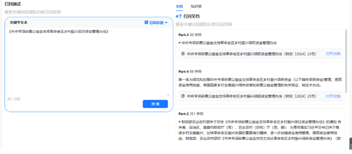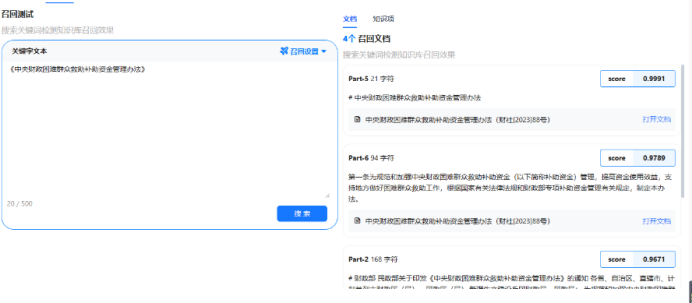 召回设置与知识库配置中的检索设置一致,默认取检索设置配置。修改召回设置之后需要重新点击“搜索”按钮进行召回测试。