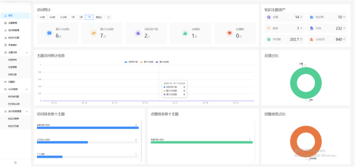 进入到AI管理后台页面,默认进入首页。首页主要用于统计和展示AI使用数据,反应当前AI平台的使用效果,包括访问统计、主题访问统计信息、主题排名等。