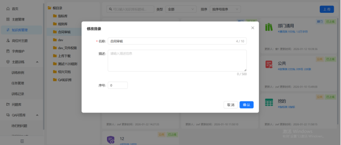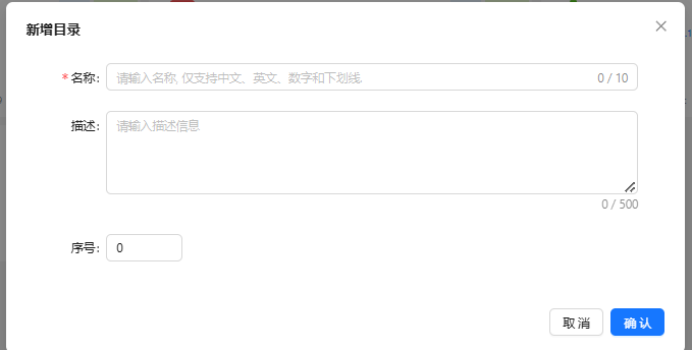 新增目录需要填写目录名称、描述、序号(从小到大排序)。