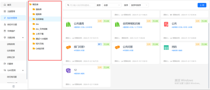 知识库目录用于用户快捷管理知识库,初始默认有根目录,用户可根据需要直接在根目录下创建知识库或在根目录下创建子目录,在子目录下创建知识库。
