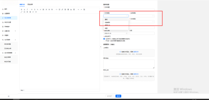 字典维护用于配置文档属性字典,用户可以根据需要对业务类型、文件类型、文件级别、有效性四个文档属性进行字段配置。