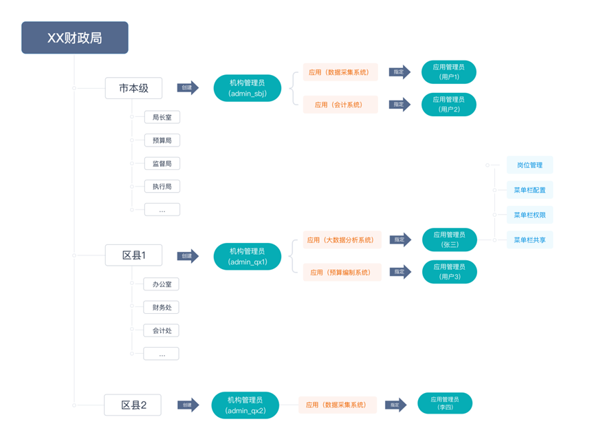 以下我们将以“xx财政局”为例,简单说明一下“分级管理”是如何实现的。