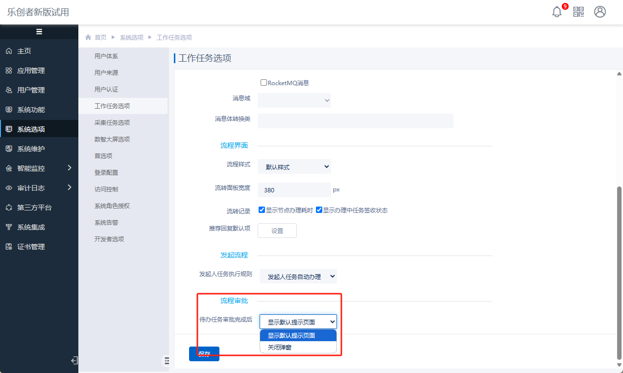 在工作任务选项中可以配置与工作任务(即工作流)相关的公共配置。