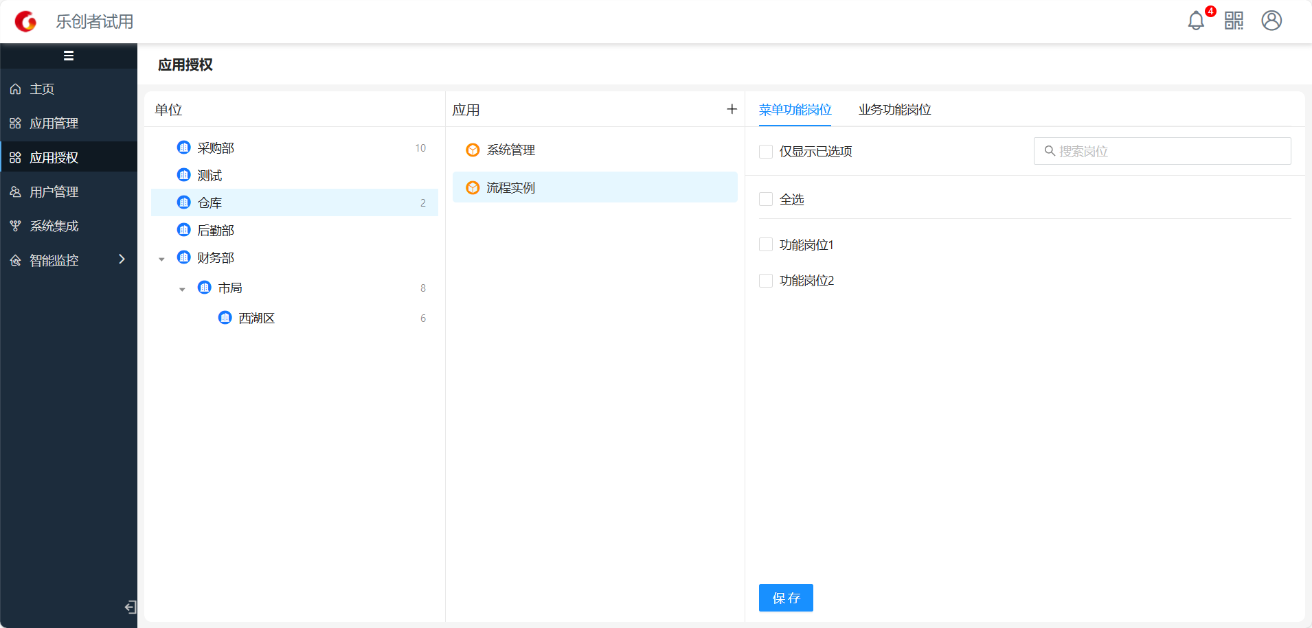 注:每个单位的对应应用的岗位权限配置完成后均需手动进行保存才能生效。