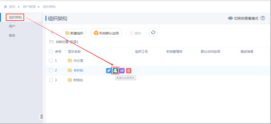 若“区县1”的某个或某些子组织下的数据也需要分配给其他人去维护,同样的,为其分别配置单位管理员即可(例如:为组织“会计处”配置单位管理员)。