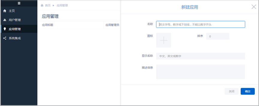 点击“应用管理”进入应用列表,通过【新建】为本机构创建应用“大数据分析系统”,如下图:
