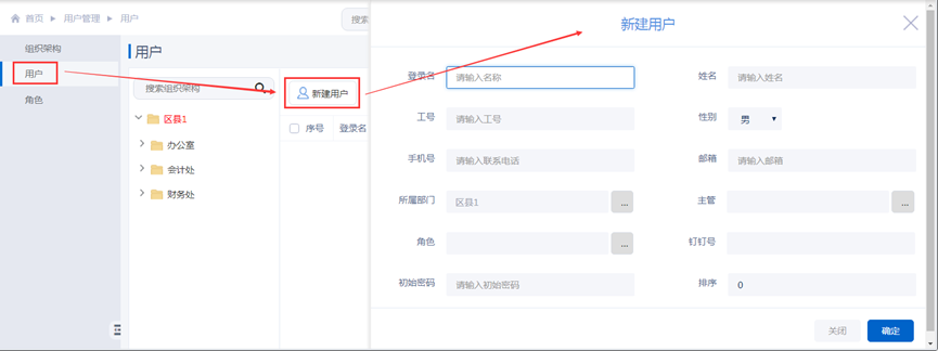 进入“用户管理>用户”界面,通过【新建用户】创建本机构范围内的用户,配置用户相关属性,如:所属部门、主管、角色、初始密码等,如下图: