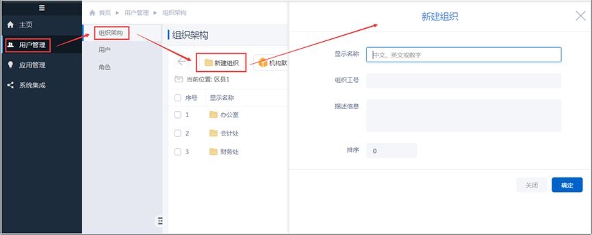 进入“用户管理-组织架构”界面,通过【新建组织】创建本机构范围内的组织,如下图: