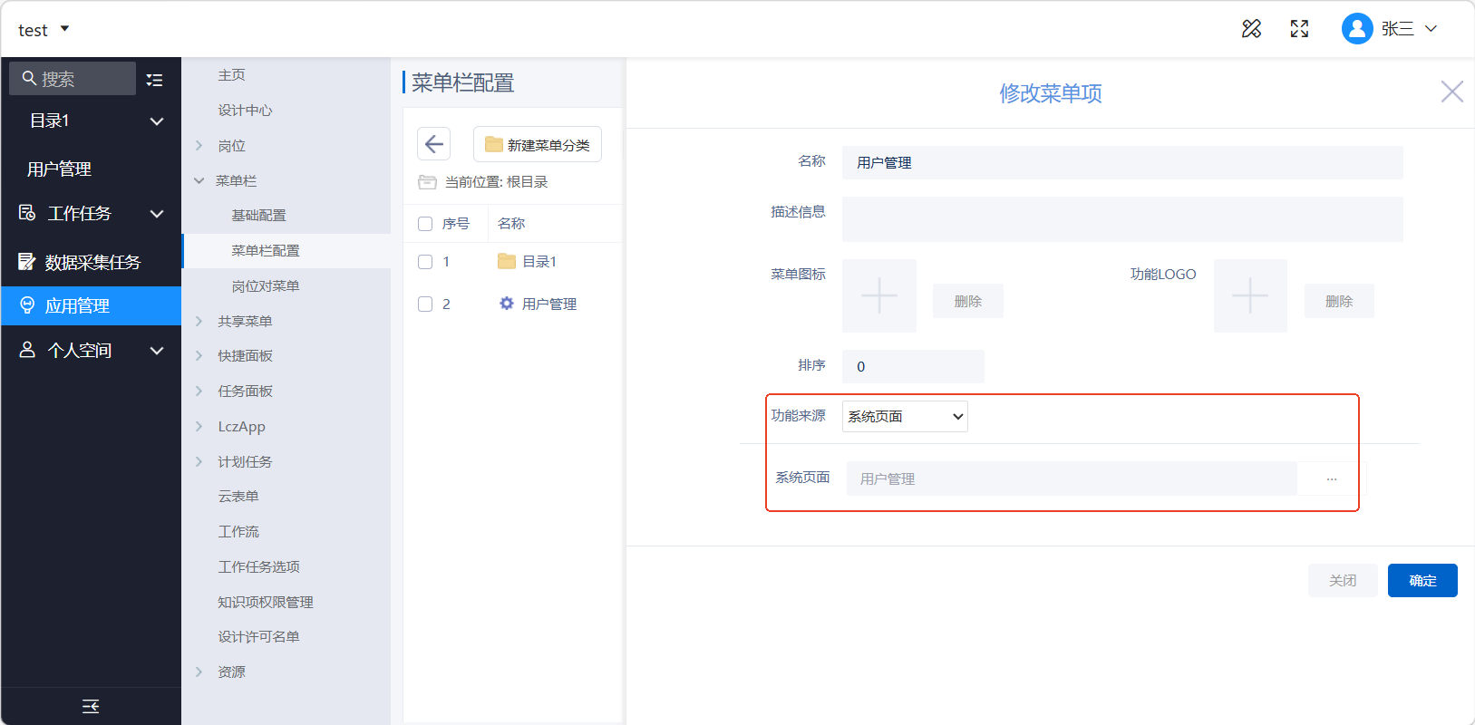 想要将用户管理功能下放给普通用户,还需要应用管理员在门户中配置“用户管理”菜单并将分配该菜单权限,菜单配置时数据来源需选择“系统页面”,选择“用户管理”页面,如下图: