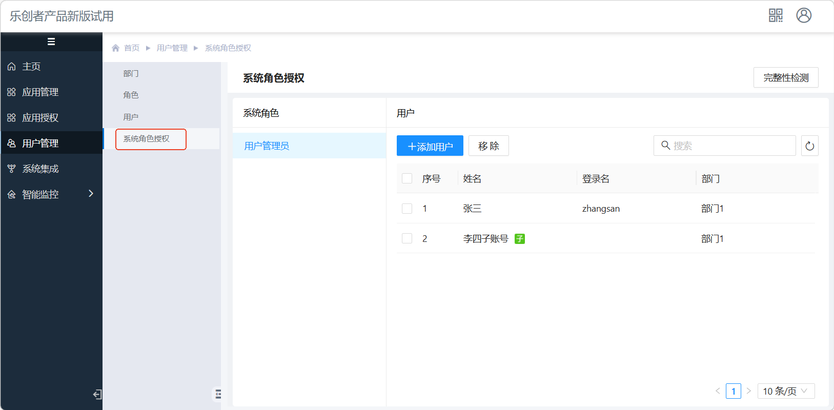 可通过“系统角色授权”菜单,添加用户,将普通用户(可选择子账号)授予“用户管理员”角色,如下图: