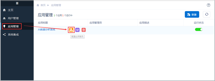 鼠标移动到已经创建的应用“大数据分析系统”上,出现“配置应用管理员”按钮,如下图: