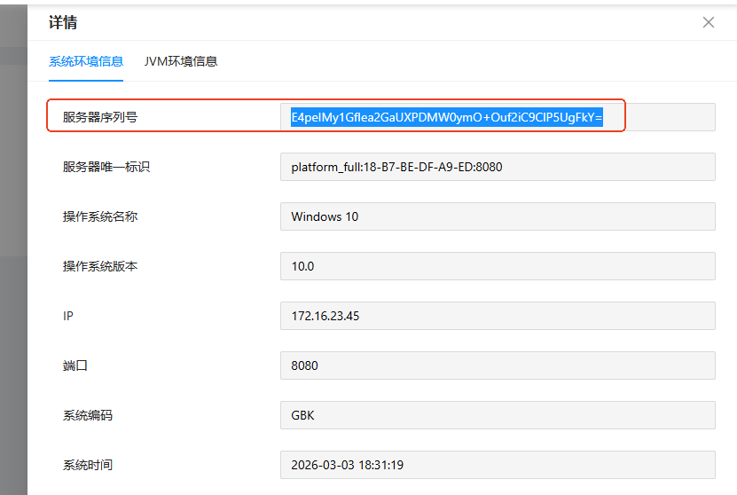 平台管理员账户登录lczPortal,进入服务管理模块,点击“platform_full”类型服务的查看详情,进入服务详情页面,查看“系统环境信息->服务器序列号”,如下图: