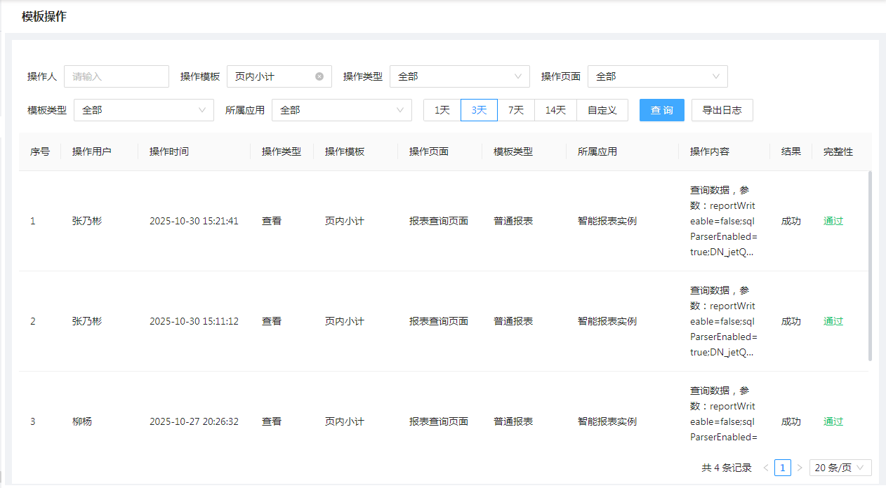 另外,还可以根据用户姓名、模板名称、操作类型(包括查看、提交、导出、打印、链接)、操作页面(包括列表页面、新增页面、修改页面、详情页面、报表查询页面、报表填报页面)以及访问时间等条件对数据进行筛选,查看符合条件的数据。比如,查看近3天用户对“页面小计”模板的操作记录,查询结果如下图: