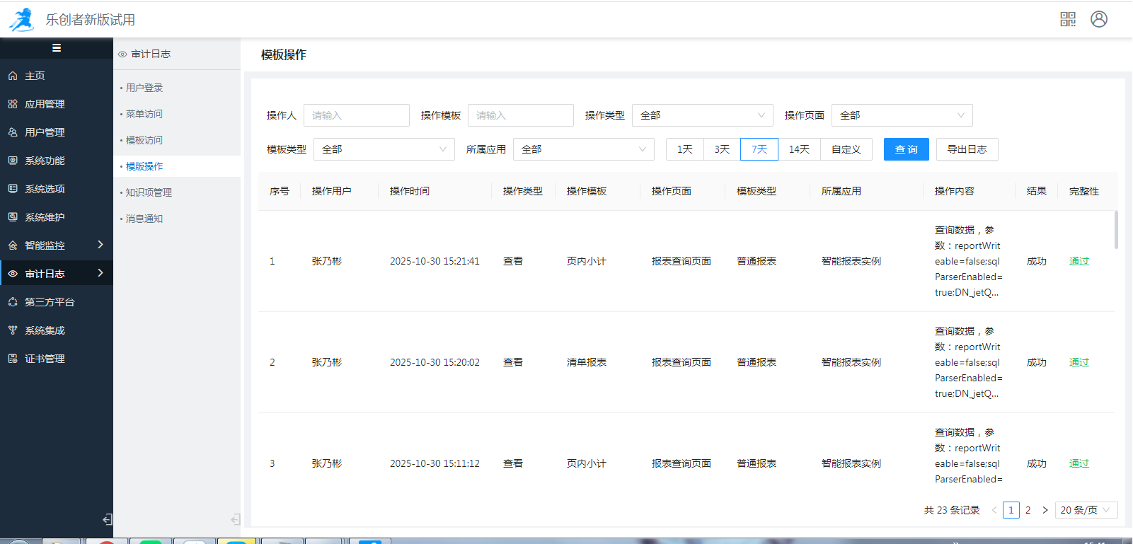 系统管理员登录系统后,执行[审计日志>模板操作]菜单,如下图: