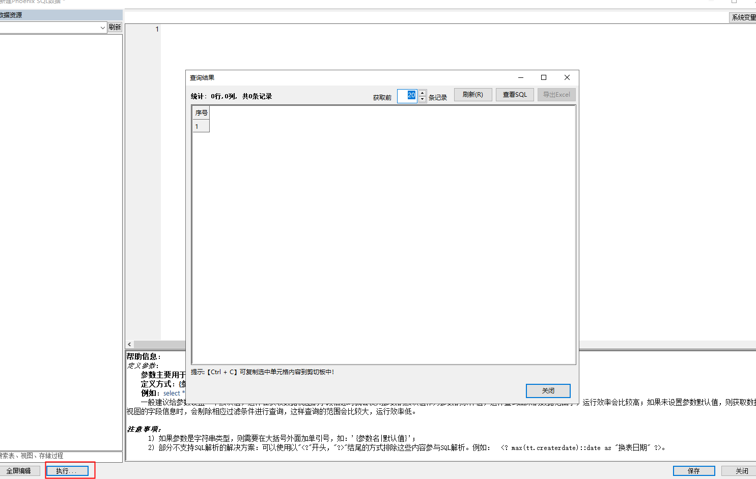 和普通的JDBC视图类似,左侧表列表,右侧是SQL编辑器,在编辑器中编写要执行的SQL语句(标准的SQL语法),编写完成后可以点击“执行”预览数据。
