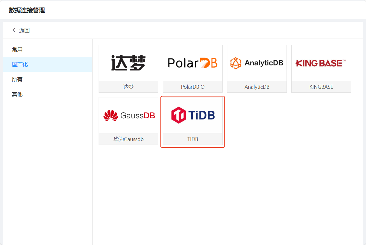 以管理员身份登录门户,进入“应用管理>设计>数据连接管理”界面,点击“+”,在“国产化”选项下选择 “TIDB”,如下图所示: