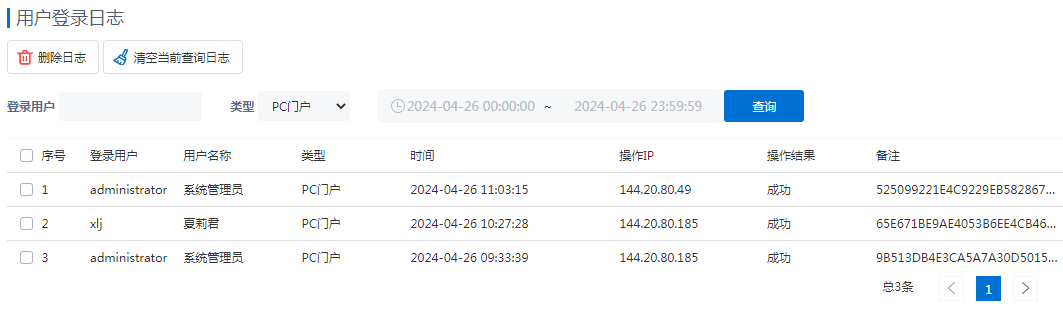 另外,还可以根据用户姓名、访问客户端以及访问时间对数据进行筛选,查看符合条件的数据。比如,仅查看通过PC端门户访问系统的用户,则客户端选择“PC门户”即可,如下图: