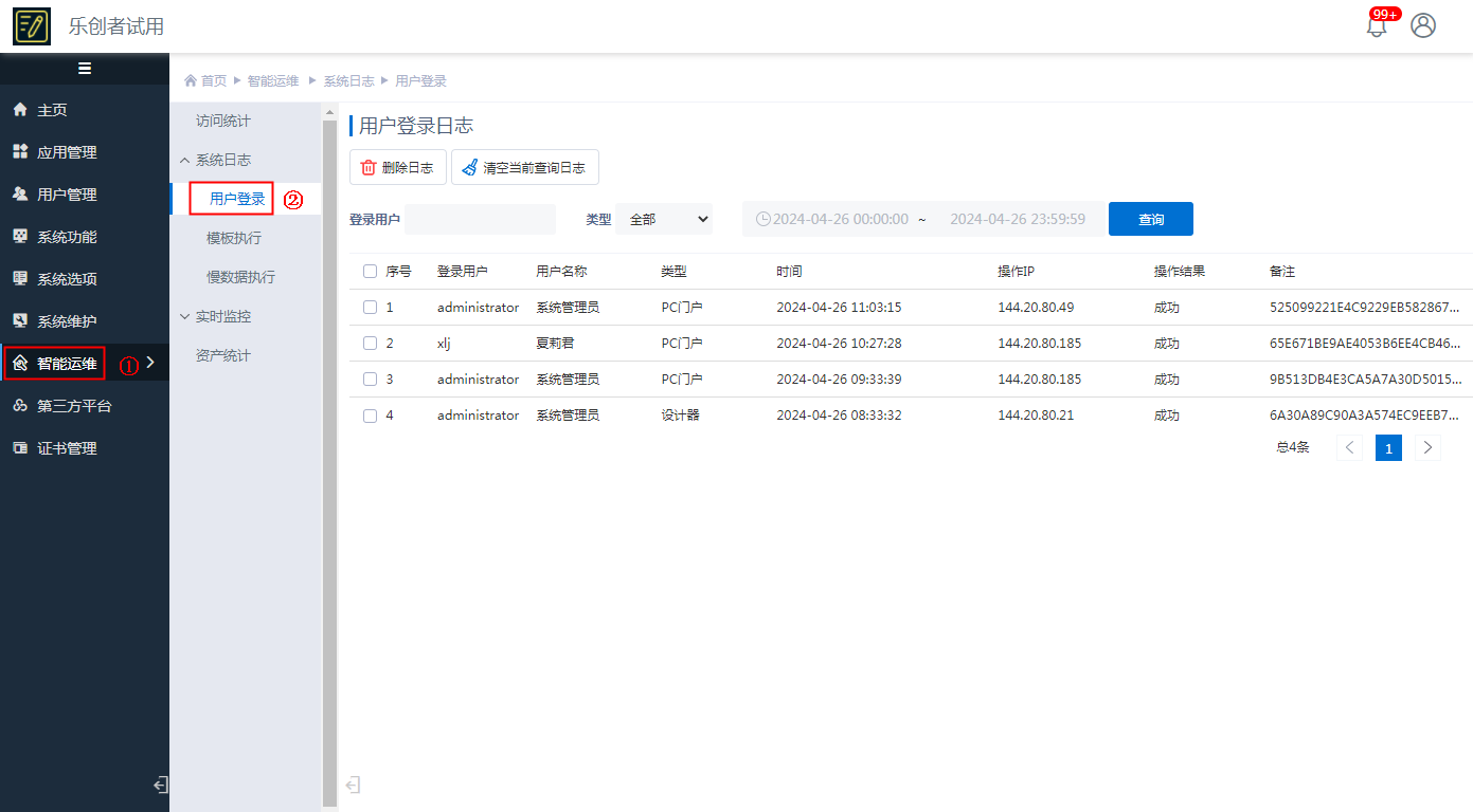 系统管理员登录系统后,执行[智能运维>系统日志>用户登录]菜单,如下图: