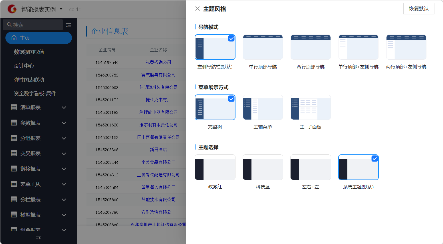 点击 “恢复默认”按钮,可将您个人的“主题风格”设置(包括导航模式、菜单展示方式、主题选择)全部重置为系统管理员配置的默认值。