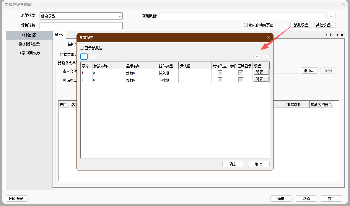 - 参数设置:可以定义模版的参数,可以接收外部传参或在界面上手动选择,用来给各个tab模版的参数传值使用。手动选择时可使用的参数控件支持输入框、下拉框、日期选择控件等,【参数设置】配置界面如下: