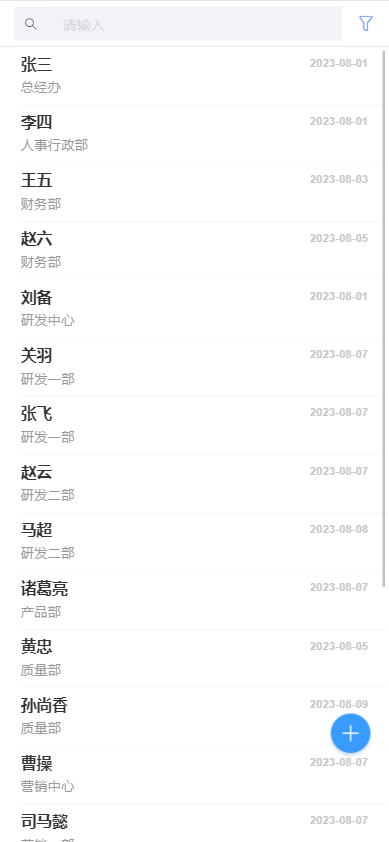 在【移动页面布局】中,点击【模版向导】,在如下界面中对移动端列表模版进行配置,可以在现有的模版范围内选择自己想要的模版进行字段配置。例如我们示例中配置了字段“员工姓名”、“部门”和“入职时间”,意味着移动端列表页面将按指定的位置显示这三个字段。