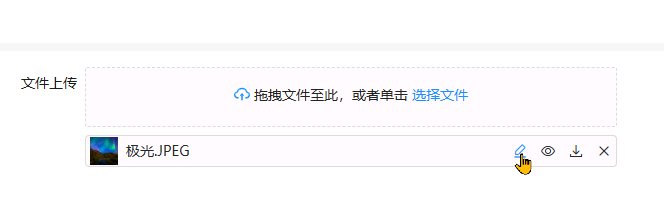 最大文件上传数为1时,选择文件时仅支持单选,文件上传成功后不再显示上传按钮,文件上传后支持在编辑页面对文件进行删除、下载,部分文件类型支持在线预览
