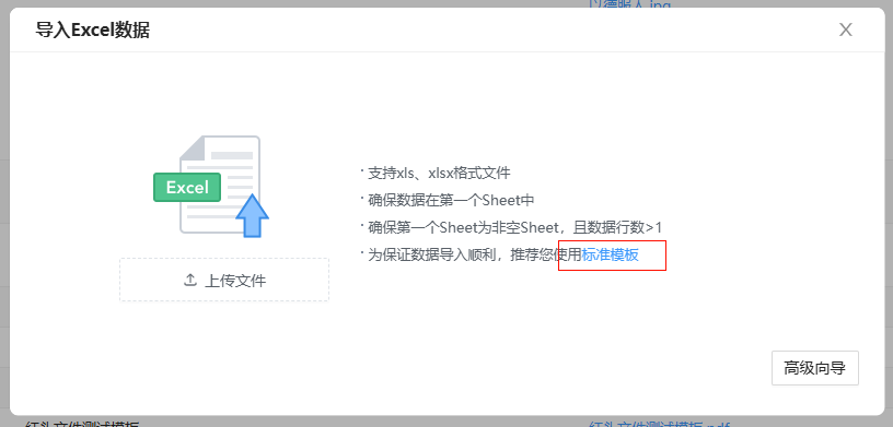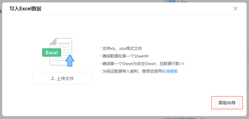 未勾选时,前端界面默认使用标准简易导入模式,若需使用高级向导分步导入需要手动切换。