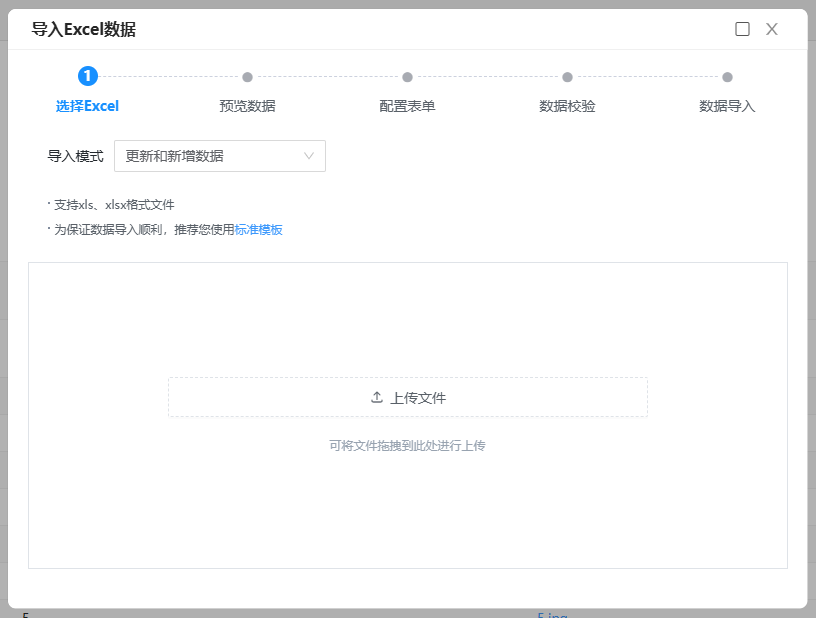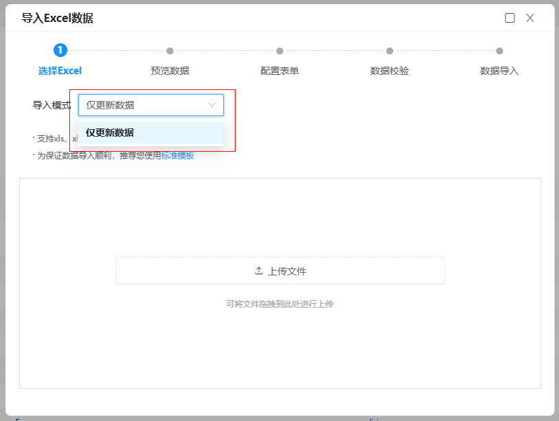 首先,用户可根据需要选择适合的导入模式,支持三种模式:仅新增数据、仅更新数据、新增和更新数据。