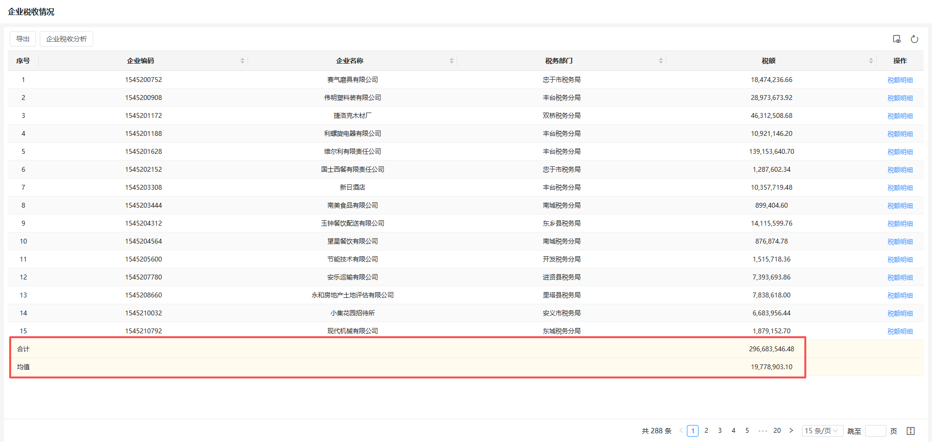 例如希望对实例“企业税收”表单的列表页面的税额数据进行统计,如下图所示。