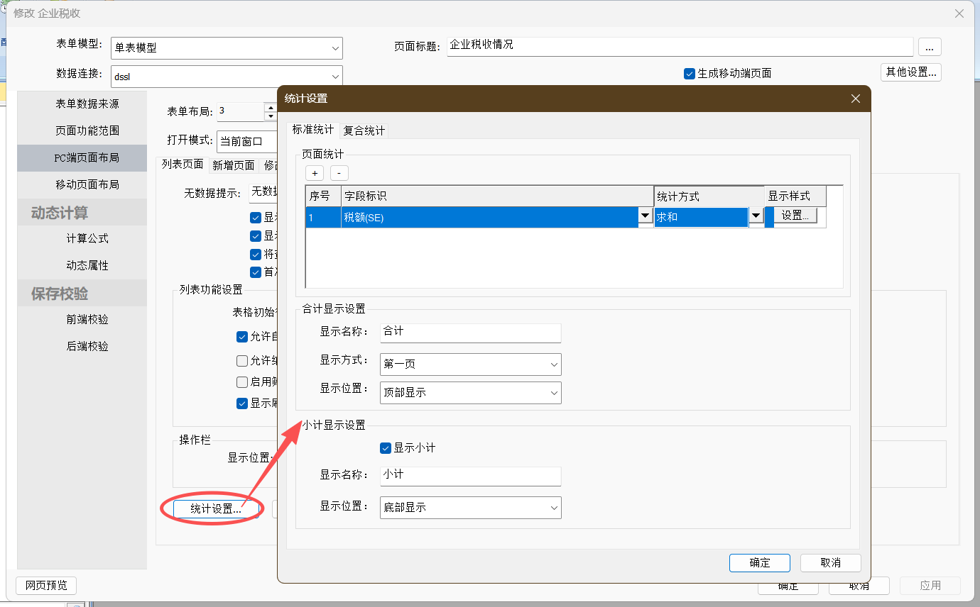 • 页面统计:用于添加需要进行统计的字段、统计方式和显示样式。