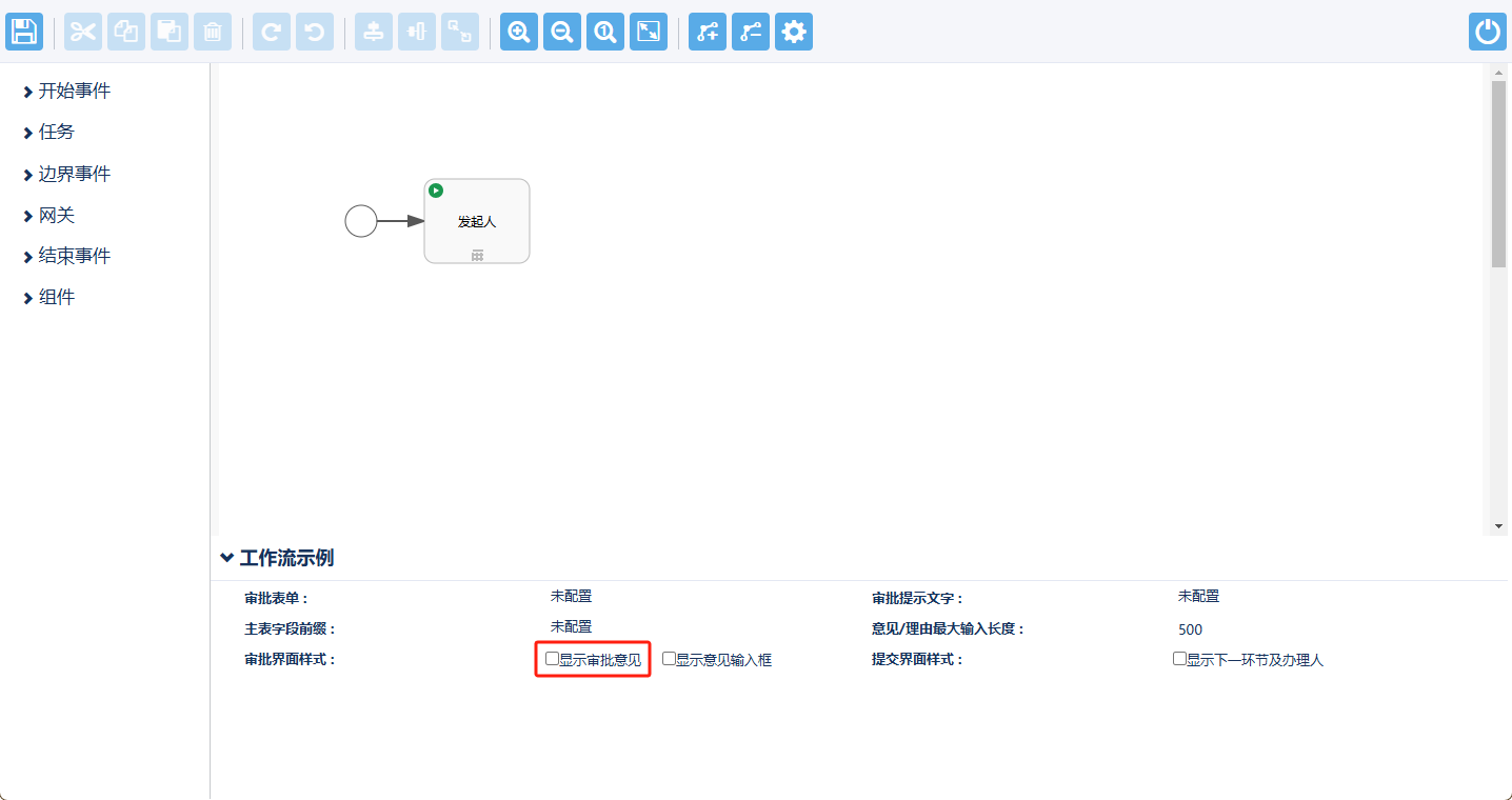 流程全局配置界面提供配置开关,默认不开启,允许配置是否在右侧流转情况旁边显示一个【审批意见】tab,配置界面如下图所示。