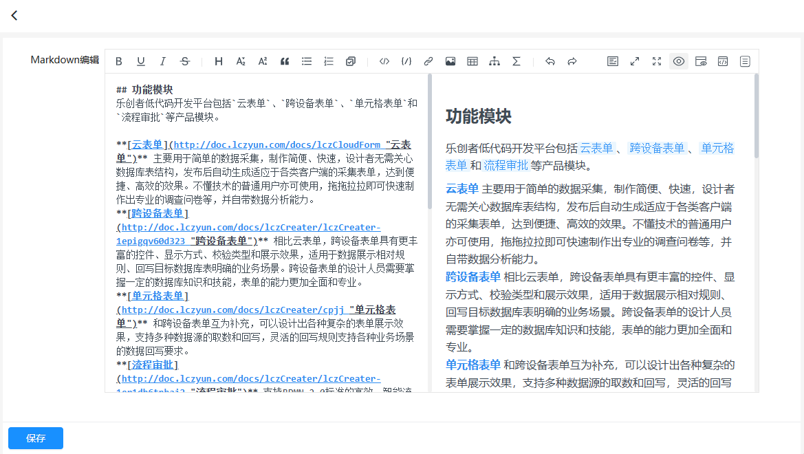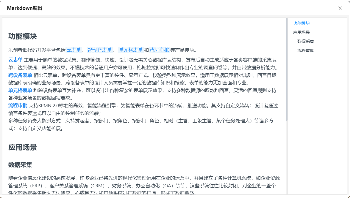 Markdown编辑控件可用于通过表单编辑一些带样式的结构化数据,例如文章、通知、新闻稿等,且需要用到章节目录展示和定位功能。(V7.5.0版本新增)
