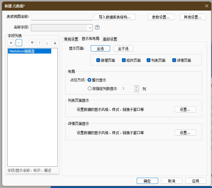 - 默认整行显示,详细配置说明请查阅章节 元数据>字段显示与布局