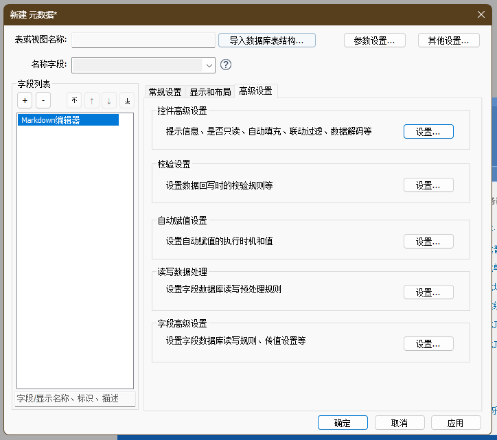 - 支持控件高级设置、校验设置、自动赋值设置、读写设置和字段高级设置等,详细配置说明请查阅章节 元数据>字段高级设置