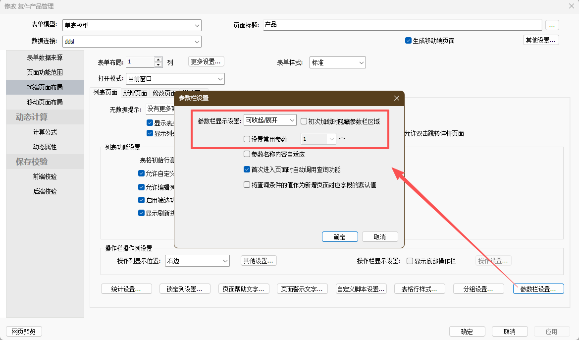 在版本V7.5.0中将PC端表单列表页面参数栏相关设置集中至如下图弹窗中进行配置,且针对参数栏的显示布局允许在红框示意的配置项中进行灵活配置: