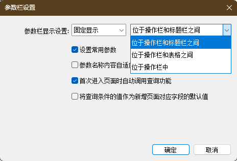 当参数栏设置为固定显示时,为满足不同表单设计习惯的设计要求,目前支持指定三个固定参数栏展示位置,且同样支持设置常用参数,配置界面如下图所示。