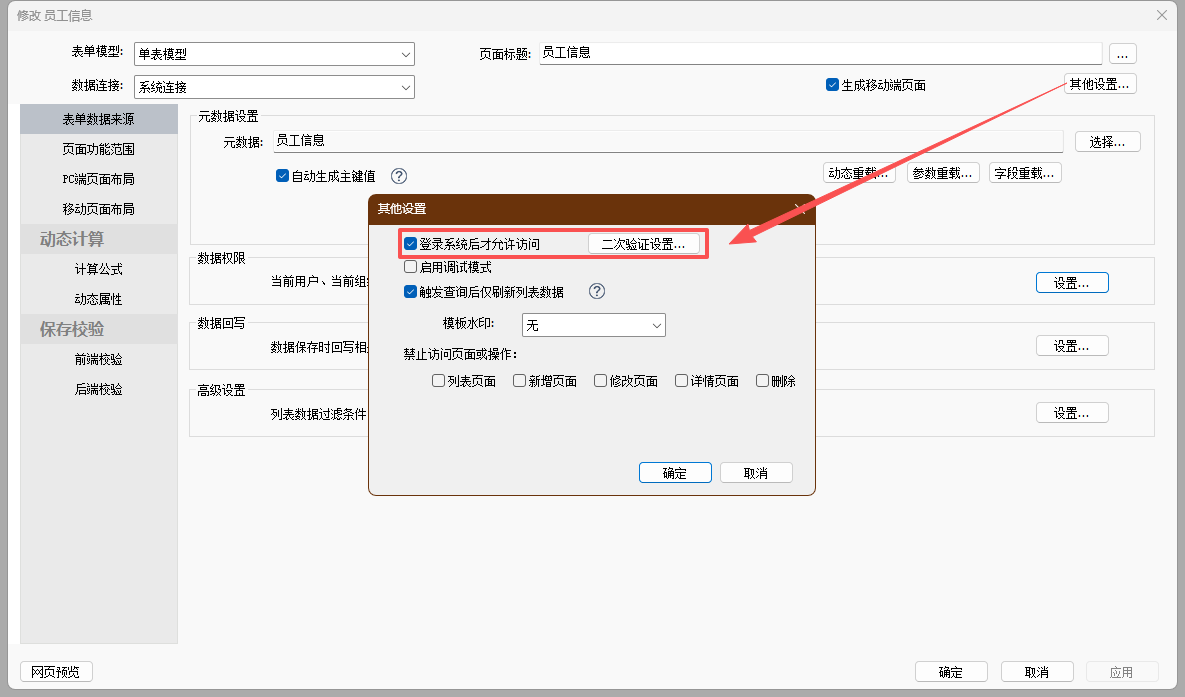 在模板右上角【其他设置】中可以对二次验证进行设置,正如概述中所说的,二次验证配置需要基于表单访问本身需要用户登录信息,因此仅【登录系统后允许访问】勾选时才支持配置。