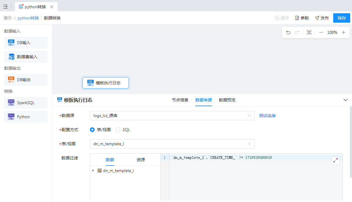 【Pyhon】节点支持的功能包括:SQL语句和数据预览。与【SparkSQL】类似,这里不再重复介绍,不同的是:代码中需要编写Pyhon脚本。