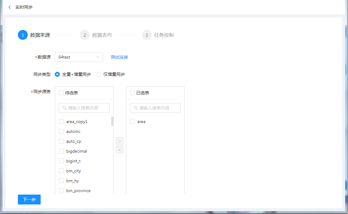 实时同步任务的3步分为:“数据来源”、“数据去向”和“任务控制”。