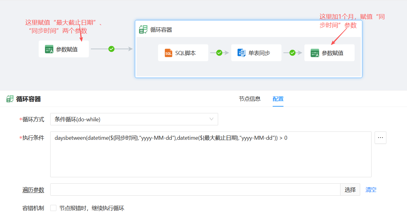 - 默认不勾选:当一次循环中有节点执行报错,不再进行下一次循环。
