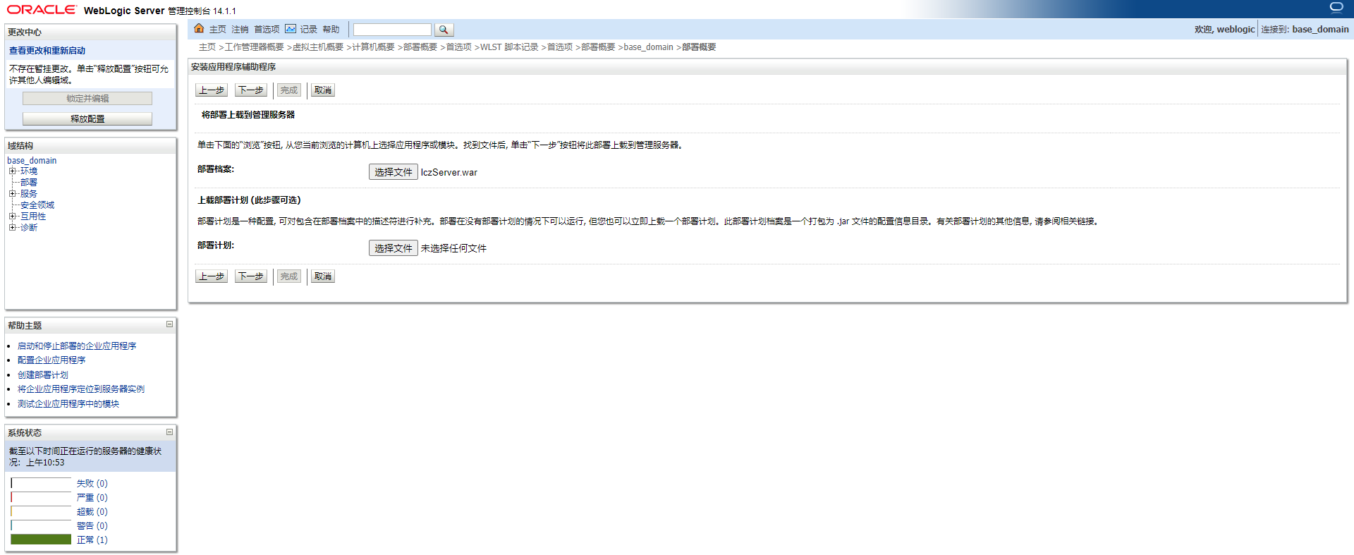 在部署节点的列表中点击“安装”按钮,在安装应用程序页面点击“上载文件”,选择下载的lczServer.war包: