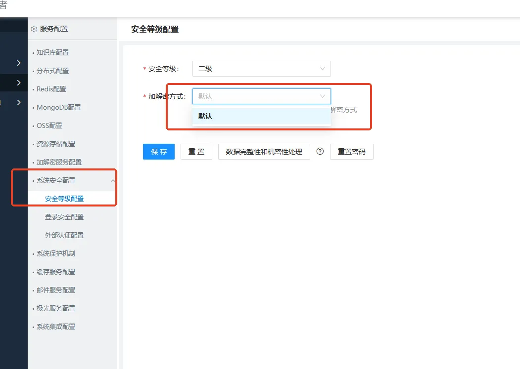 从v8.0.0版本开始,乐创者通过扩充了一套加解密标准接口,开放对接外部的加解密服务的能力。并实现了系统内部对系统配置(对接的redis、mongodb等服务配置信息)、用户表(dn_user)、用户对角色(dn_map_user_role)、审计日志数据表等相关字段的机密性、完整性控制。