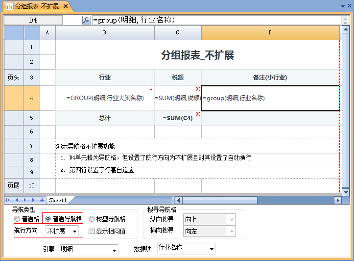 一般情况下,如果某个单元格为导航格,则意味着在报表执行时该单元格将会扩展出多个数据项,且会纵向向下或横向向右扩展。