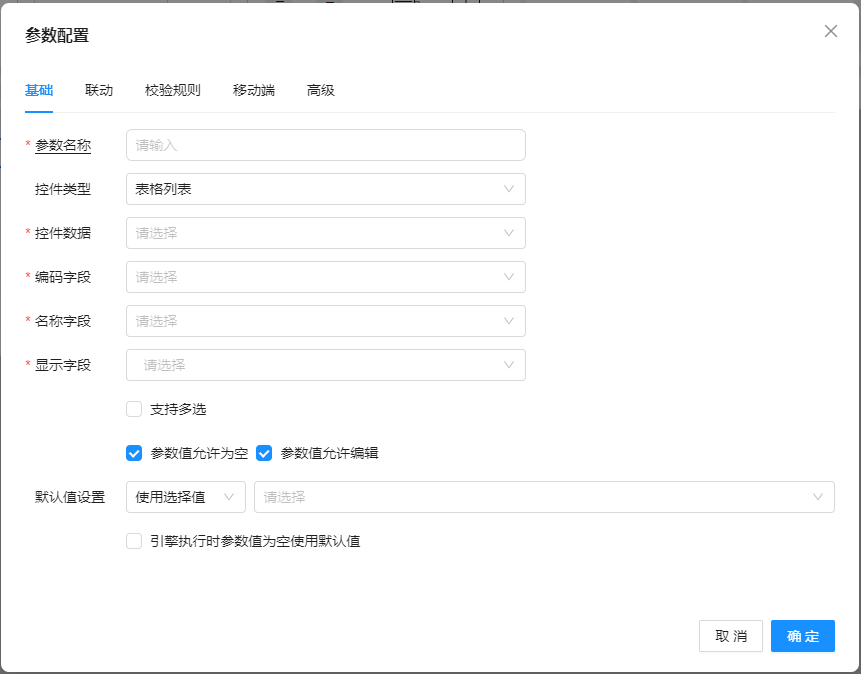 参数支持的控件类型包括: 输入框、下拉框、列表框、树、日期、复选框和表格列表,如下图: