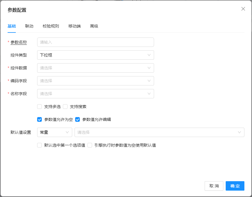 关键的操作步骤在于设置控件数据,选择一个模板数据源作为下拉框的数据来源,并设置正确的编码字段和名称字段。以“客户”参数为例,设置如下图: