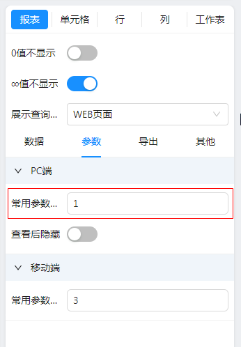 属性栏切换至[报表],将“常用参数个数”设置为:1,如下图: