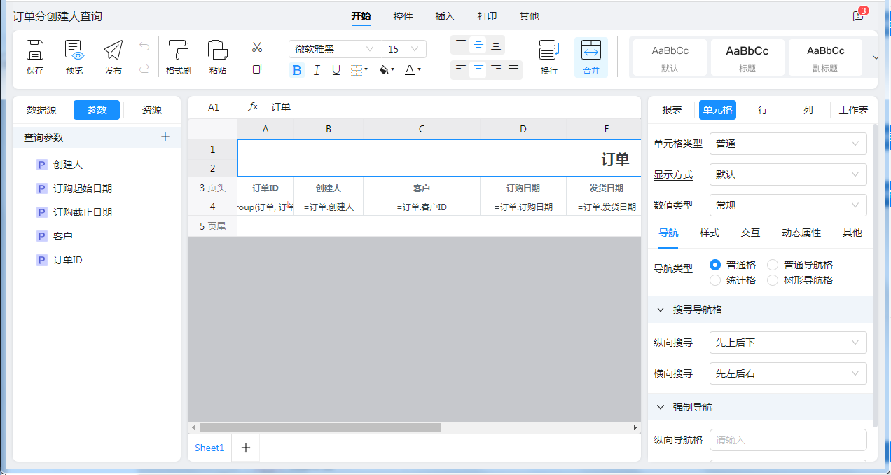 业务中存在5个模板参数,分别为“创建人”、“订单起始日期”、“订单截止日期”、“客户”、“订单ID”。