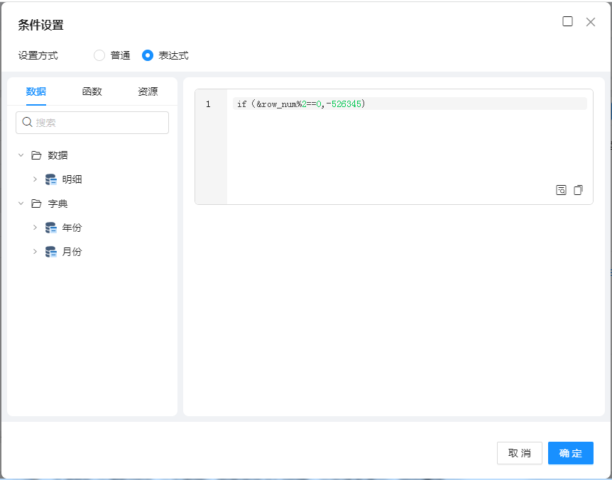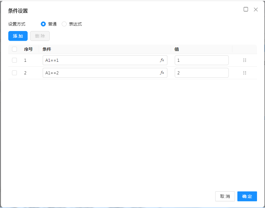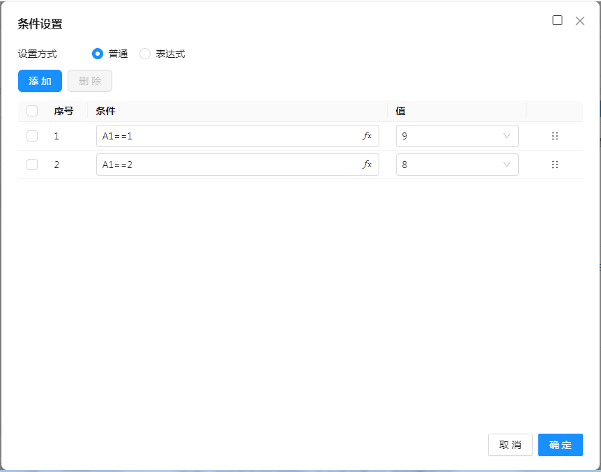 隐藏、剔除、行高自适应、允许增加行、允许删除行属性设置类似,以隐藏为例,例如:判断A1单元格值为1时,当前单元格所在行隐藏,当为2时,则当前单元格所在行不隐藏。条件配置如下图: