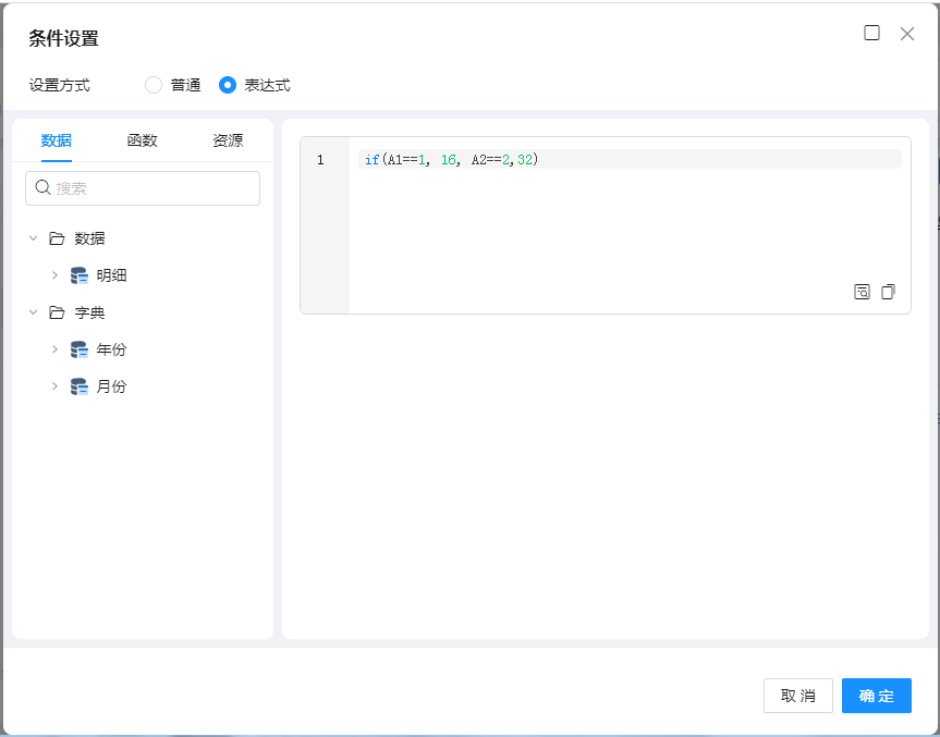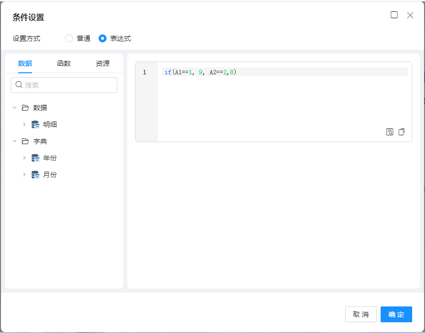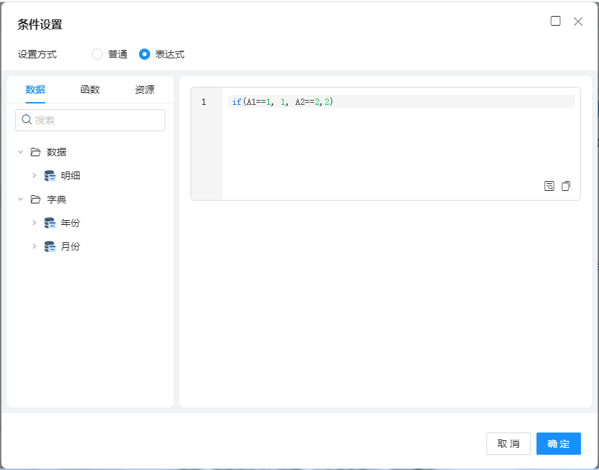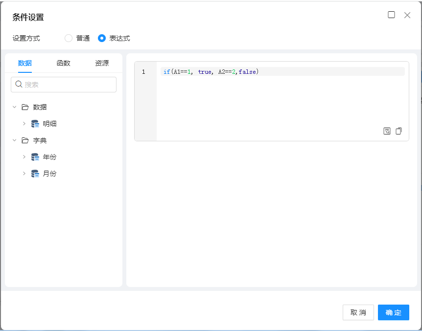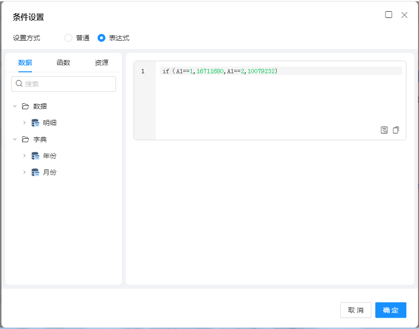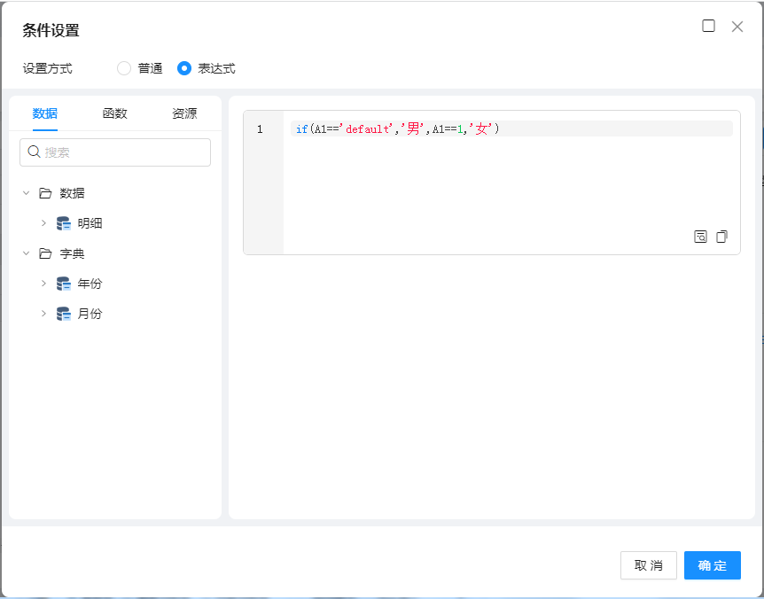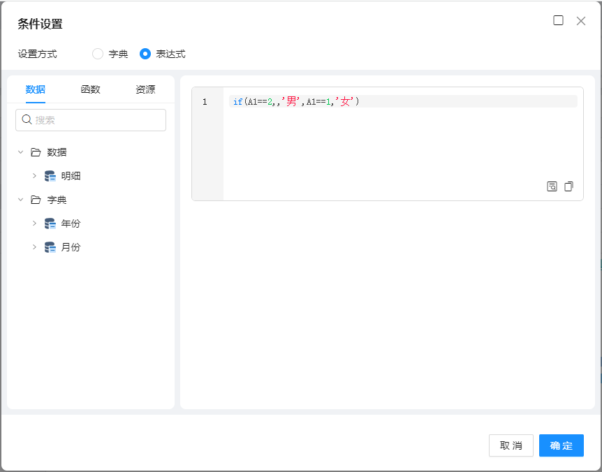 设置条件表达式来显示当前单元格的显示内容。例如:判断A1单元格值为2时,当前单元格显示男,当为1时,则为女。条件配置如下图: