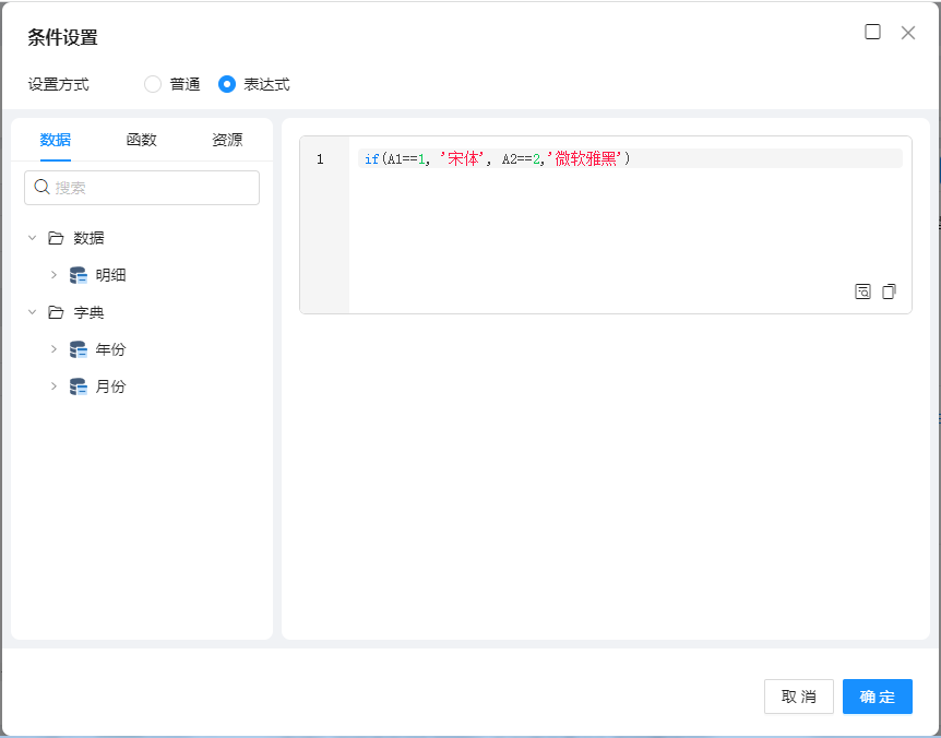 设置条件表达式来显示当前单元格的字体格式。例如:判断A1单元格值为1时,当前单元格字体宋体,当为2时,则为微软雅黑。条件配置如下图: